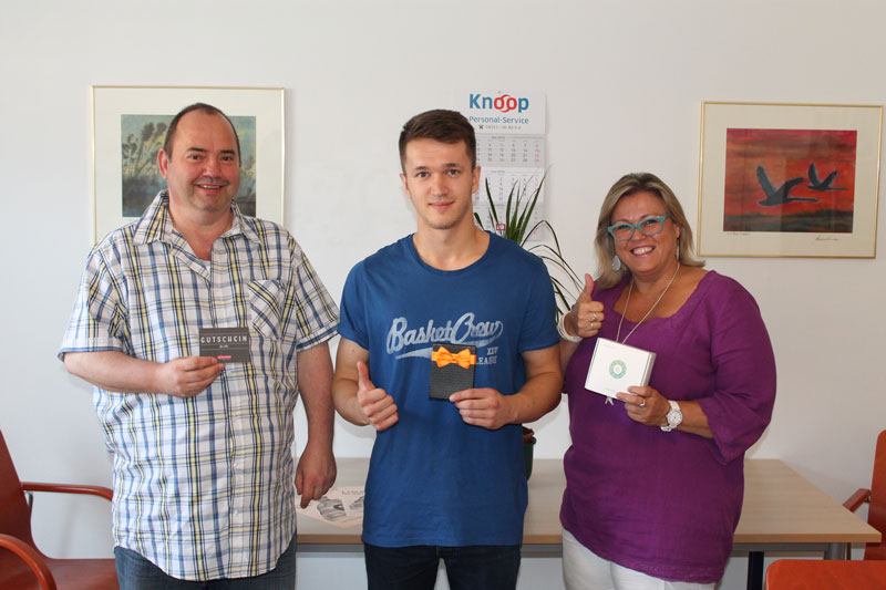 Unsere neue Lübecker Auszubildende Rojda Acar durfte den 3. Sieger ziehen und hielt den Tipp von unserer Bad Segeberger Niederlassungsleiterin Gerda Gergaut in der Hand, die nun die Powerbank erhielt.