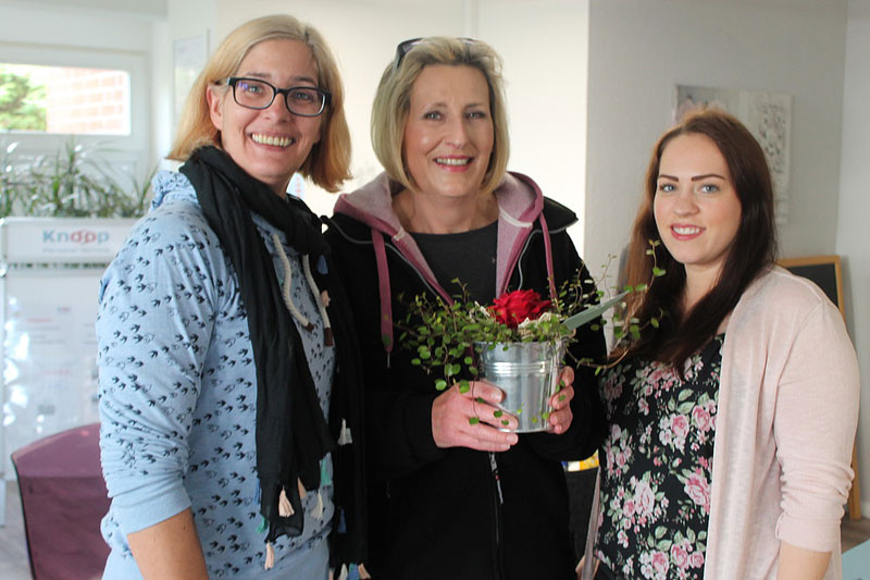 Niederlassungsleiterin Ulrike Kurz sowie Disponentin Sylvia Oswald überreichen Frau Dörte Ziesmann einen kleinen Blumengruß zum Abschied.